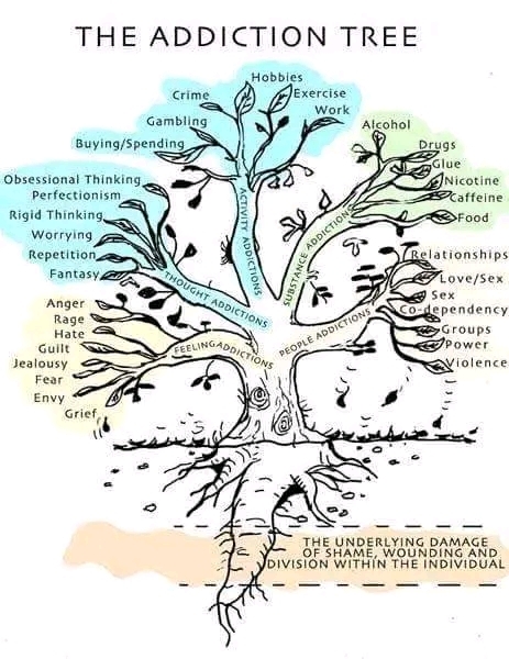Kutoka kwenye hisia, mawazo, au mahusiano yasiyo na afya, huchipuka tabia za uraibu tunazoona nje. Matawi haya yamegawanyika katika makundi matatu: